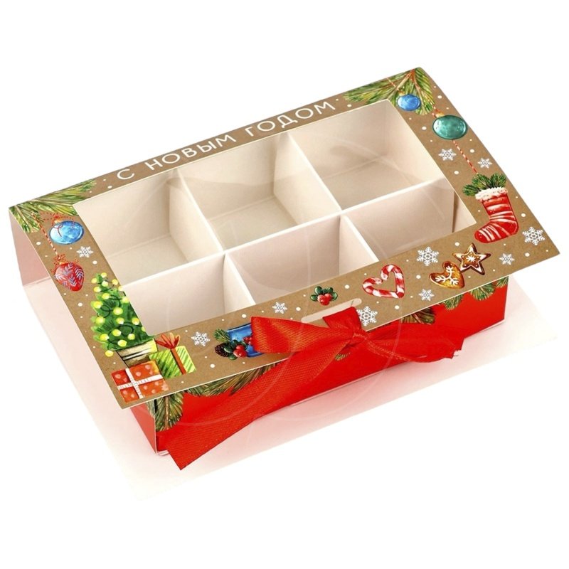 Доставка Коробка на 6 конфет с окном "Новогодние элементы" 14,5х9,5х3,5 см из магазина в вашем городе: